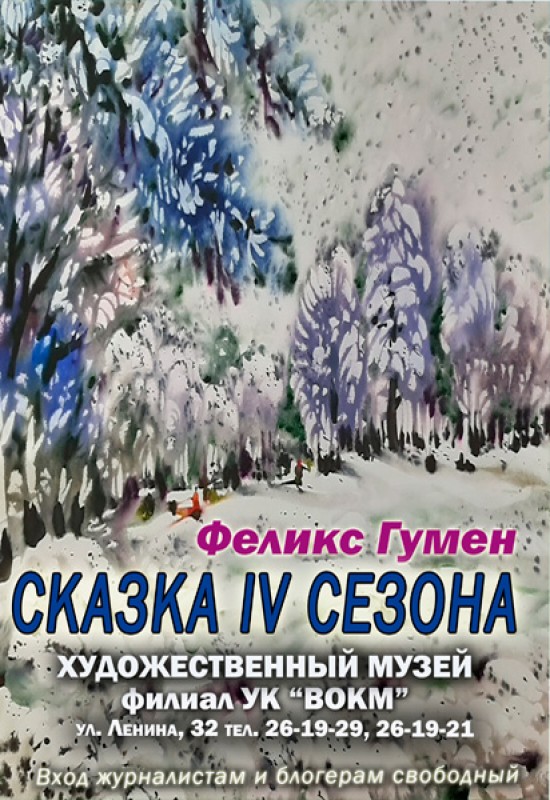 В экспозицию выставки «Сказка IV сезона» вошли двадцать зимних пейзажей 2017-2020 годов. Художник писал Витебск и его пригороды Лужесно, Бороники, есть и вид Полоцка. Акварели Ф. Гумена написаны с удивительным чувством и мастерством: выразительность контуров, линий, эмоциональные переходы цвета, крупные формы. Художник создаёт свои работы в ярком порыве души, на одном дыхании, выплёскивая в них свою энергетику и неординарность.