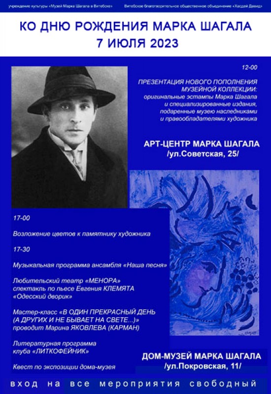 - В 17:00 горожане и гости Витебска смогут возложить цветы к памятнику Марку Шагалу, расположенному в начале улицы Покровской, чтобы почтить память художника. А затем в саду дома-музея начнется программа, подготовленная Музеем Марка Шагала совместно с Витебским благотворительным общественным объединением «Хасдей Давид» и народным литературным клубом клубом «ЛитКофейник». Прозвучат стихи о художнике и Витебске, музыкальные номера в исполнении вокального ансамбля «Наша песня», любительский театр «Менора» покажет спектакль «Одесский дворик», творческий мастер-класс проведет Марина Яковлева (Карман), желающие смогут пройти квест по экспозиции дома-музея. Вход в сад свободный.