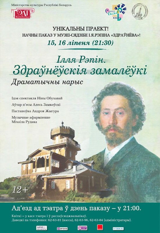 - Спектакль Коласовского театра, поставленный в форме иммерсивного странствования по усадьбе Здравнёва, вернёт зрителей в начало ХХ века. В жанре драматического очерка артисты расскажут об Илье Евфимовиче Репине и его семье, о его постоянном внутри творческое беспокойство, о том, или может искусство для гениального художника быть выше за все другие жизненные ценности. Отъезд от театра в день показа – в 21:00.