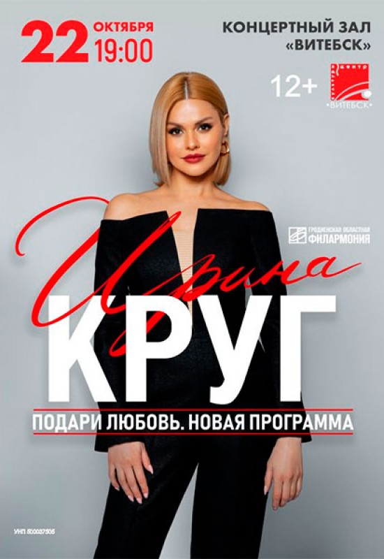 22 октября в концертном зале «ВИТЕБСК» Ирина КРУГ представит зрителям уже полюбившиеся песни, такие как «МАТЁРАЯ ЛЮБОВЬ», «МОЖЕТ ЛЮБОВЬ, МОЖЕТ КАПРИЗ», «СНЕЖНАЯ КОРОЛЕВА» и лучшие, проверенные временем хиты: «КОРОЛЕВА», «ТЕБЕ МОЯ ПОСЛЕДНЯЯ ЛЮБОВЬ», «БУКЕТ ИЗ БЕЛЫХ РОЗ» и многие другие.