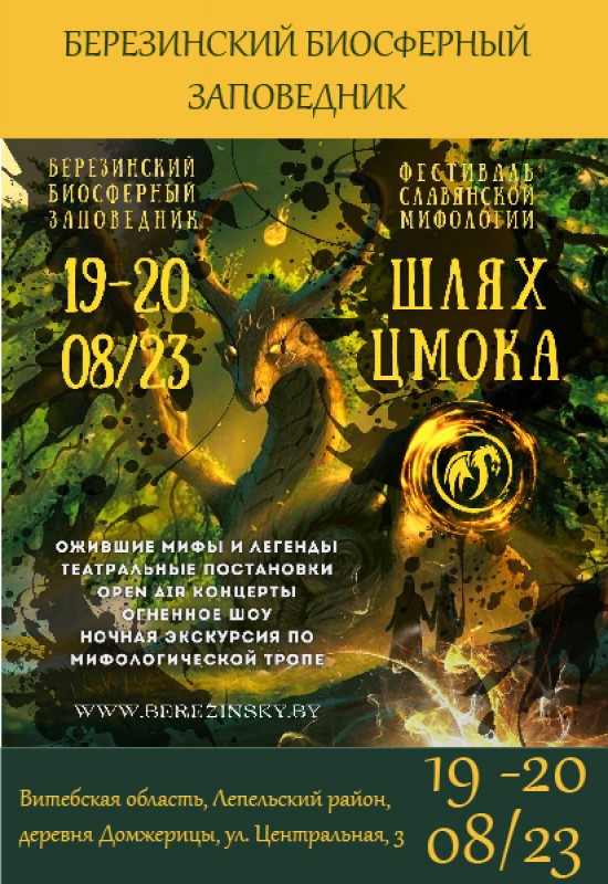 Березинский биосферный заповедник приглашает на один из самых необычных фестивалей страны – фестиваль славянской мифологии «Шлях Цмока», который состоится 19 – 20 августа 2023 года в центральной усадьбе Березинского заповедника в д. Домжерицы (Лепельский район, Витебская область).