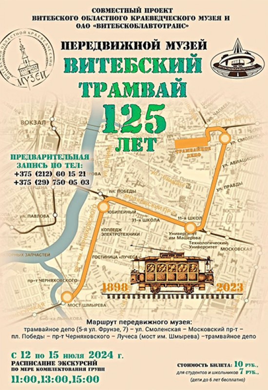 Проведение экскурсий с 12 июля по 15 июля 2024 года на передвижном музее "Витебский трамвай" для жителей и гостей Витебска будет осуществляться по следующему графику: ежедневно (по мере комплектования групп)