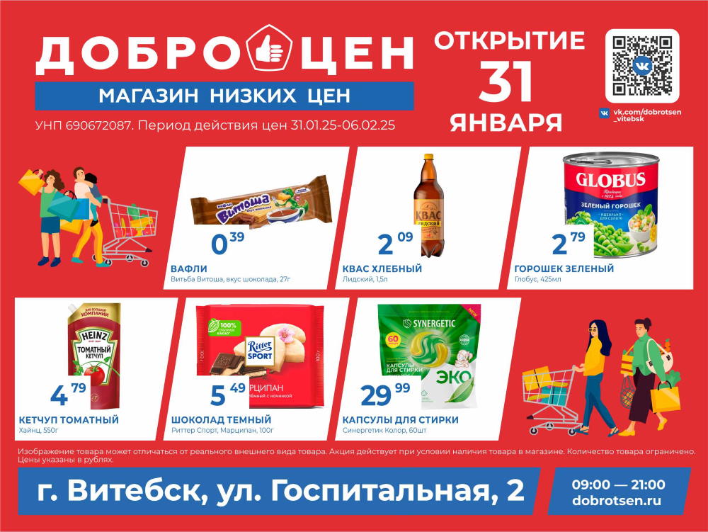 Выгодные покупки - в "Доброцене". 31 января в 09:30 состоится открытие в Витебске второго магазина «ДОБРОЦЕН». С утра двери открыты для всех покупателей. «ДОБРОЦЕН» – это рациональная экономия без ущерба качеству продукции. Приходите и убедитесь сами!