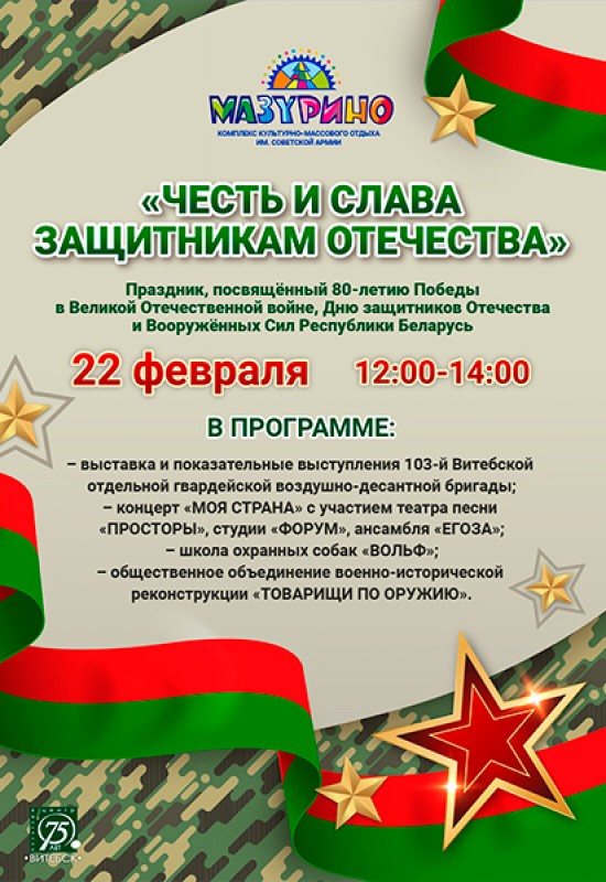 22 февраля в комплексе культурно-массового отдыха имени Советской Армии состоится праздник, посвящённый 80-летию Победы в Великой Отечественной войне и Дню защитников Отечества и Вооруженных Сил Республики Беларусь.