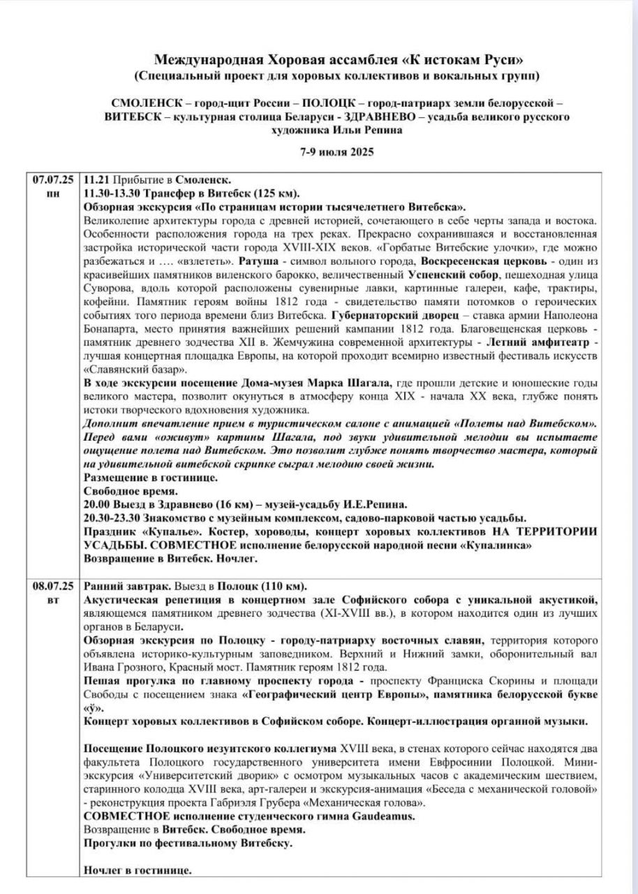 Международная хоровая ассамблея «К истокам Руси» - проект, реализуемый в масштабах Союзного государства России и Беларуси. СМОЛЕНСК – город-щит России – ПОЛОЦК – город-патриарх земли белорусской – ВИТЕБСК – культурная столица Беларуси – ЗДРАВНЕВО – усадьба великого русского художника Ильи Репина. (Специальный проект для хоровых коллктивов и вокальных групп).