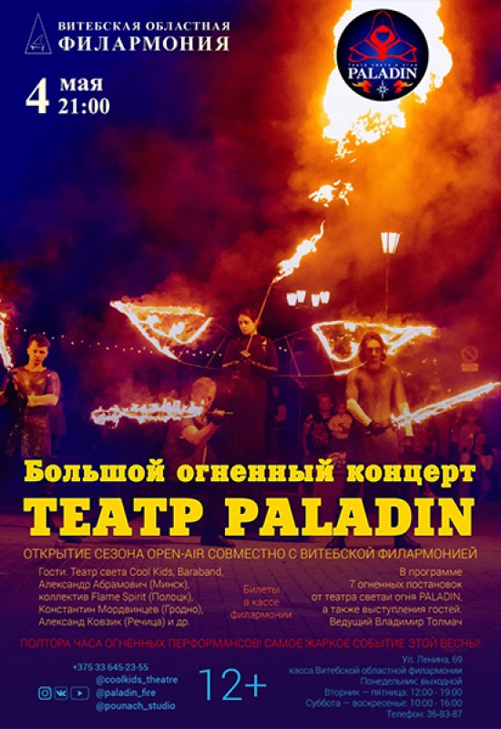 Приглашаем вас на самое жаркое событие этой весны! В программе — полтора часа захватывающих огненных перформансов от уникального театра света и огня PALADIN и гостей из Витебска, Минска, Полоцка, Гродно и Речицы.