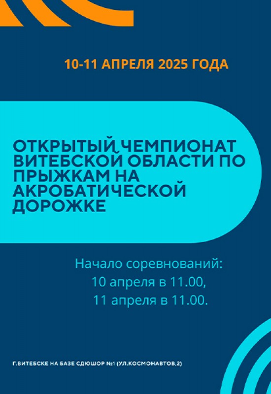 10-11 апреля 2025 года в г. Витебске на базе СДЮШОР №1 (ул. Космонавтов, 2) пройдет открытый чемпионат Витебской области по прыжкам на акробатической дорожке.