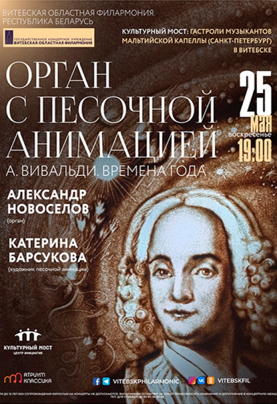 25 мая вы услышите оригинальную интерпретацию цикла Антонио Вивальди: «Времена года», которые прозвучат в переложении для органа в исполнении выдающегося органиста Александра Новосёлова. Невероятную музыку дополнит завораживающая песочная анимация в исполнении художника песочной анимации Катерины Барсуковой!