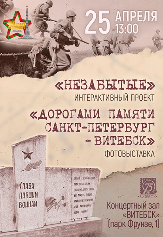 В центре мероприятия — уникальная фотовыставка «Дорогами памяти. Санкт-Петербург — Витебск», где гости смогут увидеть памятники войны, статуи, символизирующие мужество и отвагу, а также могилы неизвестных солдат, которые стали частью нашей истории.