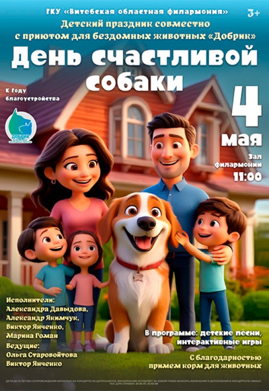 Витебская областная филармония приглашает детей и взрослых на добрый и светлый праздник – "День счастливой собаки". Мероприятие проводится совместно с приютом для бездомных животных "Добрик" и посвящено Году Благоустройства.