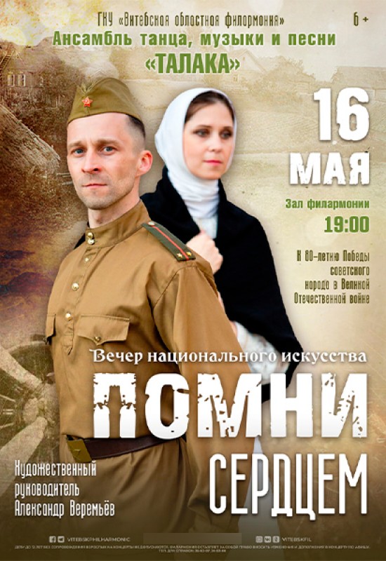 Ансамбль танца, музыки и песни "Талака" Витебской областной филармонии 16 мая представит театрализованную программу "Помни сердцем", приуроченную к 80-летию Победы советского народа в Великой Отечественной войне.