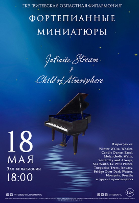 Зрители концерта «Неоклассика: фортепианные миниатюры» услышат авторские работы Infinite Stream (Санкт-Петербург) и Child of Atmosphere (Витебск) — современные фортепианные пьесы, где простота звучания открывает глубину переживания. В программе прозвучат лёгкие, мечтательные вальсы, способные унести в мир грёз, и глубокие, созерцательные композиции, пронизанные ностальгией и тонкой меланхолией. Музыка, исполняемая самими авторами, создаст атмосферу уюта и искренности, где каждый найдёт что-то своё.
