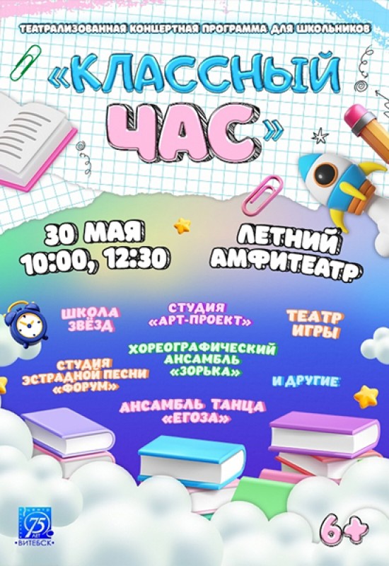 30 мая в 10:00 и 12:30, в Летнем амфитеатре состоится традиционная театрализованная концертная программа для всех школьников города «КЛАССНЫЙ ЧАС», посвящённая окончанию учебного года.