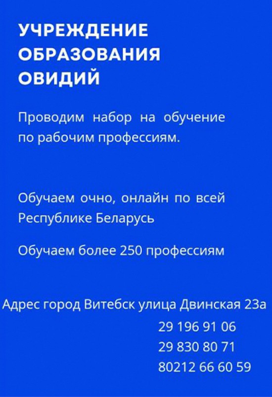 Учреждение образования Овидий проводит набор на обучение по рабочим профессиям. Обучаем очно, онлайн по всей Республике Беларусь. Обучаем более 250 профессиям.