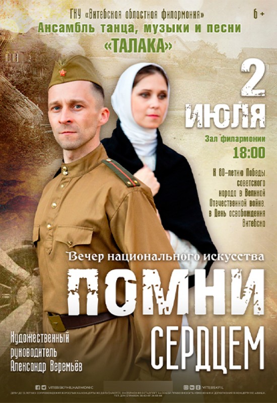 Ансамбль танца, музыки и песни "Талака" Витебской областной филармонии 2 июля представит театрализованную программу "Помни сердцем", приуроченную к 80-летию Победы советского народа в Великой Отечественной войне и ко Дню освобождения Витебска.