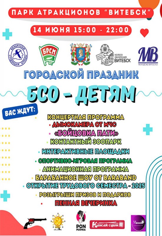 14 июня (суббота) в витебском парке Победителей состоится городской праздник «БСО - Детям» и открытие третьего трудового семестра - 2025. Мероприятие организовано совместно с Парком аттракционов Витебска.