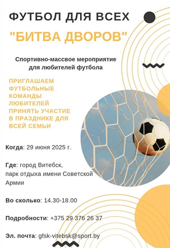 29 июня в комплексе культурно-массового отдыха им. Советской Армии (Парк Мазурино) пройдет мини-футбол для всех «Битва дворов»,среди любительски-дворовых команд г.Витебска.