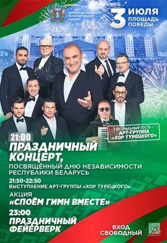 3 июля в 21:00 на площади Победы для жителей и гостей города состоится праздничный концерт, посвящённый Дню Независимости Республики Беларусь.