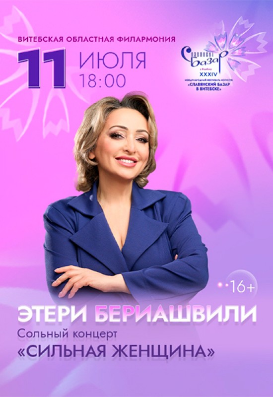 11 июля в 18:00 в рамках Международного фестиваля искусств «СЛАВЯНСКИЙ БАЗАР В ВИТЕБСКЕ» на сцене Витебской областной филармонии выступит Этери БЕРИАШВИЛИ – певица, композитор, педагог и актриса.