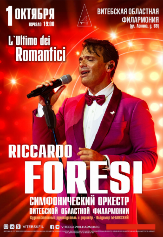 Riccardo Foresi – маэстро с голосом, покорившим мир, – впервые в Витебске! Вместе с Симфоническим оркестром Витебской областной филармонии он подарит публике два часа страсти, энергии и чистой итальянской магии!
