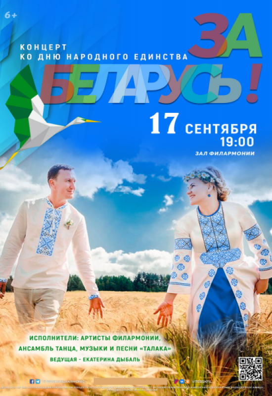 Приглашаем на концерт "За Беларусь!", который пройдет в День народного единства. Это событие станет не только важной датой для страны, но и возможностью объединиться в праздновании единства и культуры нашего народа. Этот вечер станет ярким праздником, символизирующим сплоченность, силу и богатейшее культурное наследие белорусского народа.