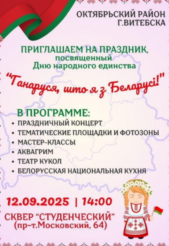 Администрация Октябрьского района города Витебска приглашает жителей и гостей города на праздник «Ганаруся, што я з Беларусі!», посвященный Дню народного единства.