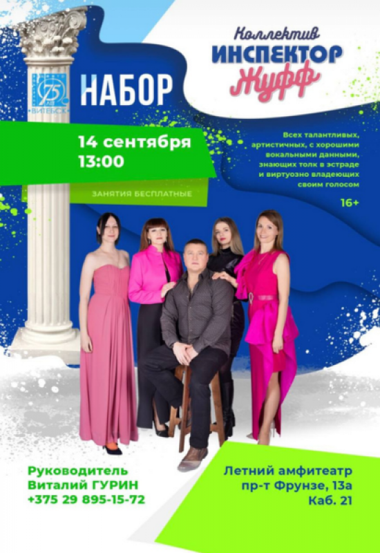 Коллектив «Инспектор Жуфф» приглашает всех талантливых, артистичных, с хорошими вокальными данными, знающих толк в эстраде и виртуозно владеющих своим голосом.