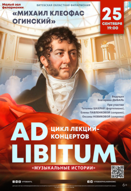Первая встреча в рамках популярного цикла лекций-концертов «Ad libitum» будет посвящена жизни и творчеству польского композитора Михаила Клеофаса Огинского. Автор знаменитого полонеза «Прощание с Родиной» предстанет перед публикой не только как гениальный творец, но и как государственный деятель и человек своей интереснейшей эпохи.