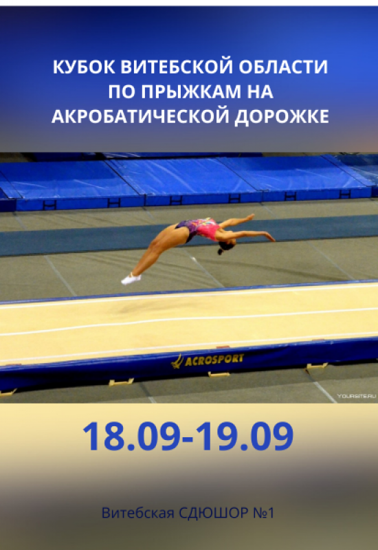 В период с 18 по 19 сентября 2025 года в г. Витебске на базе спортивного зала Витебской СДЮШОР №1 (ул. Космонавтов, 2) пройдет Кубок Витебской области по прыжкам на акробатической дорожке.Начало соревнований: