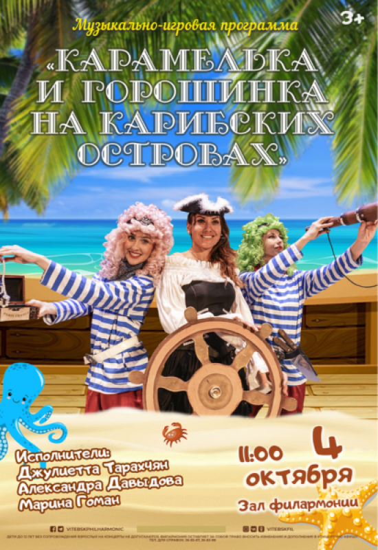 В нашей интерактивной развлекательной программе энергичная Карамелька, неугомонная Горошинка и очаровательная Гламура Цирковна отправятся вместе с ребятами на поиск сокровищ, чтобы понять, что настоящее сокровище — это не деньги и драгоценности, а поддержка, помощь, выручка, забота и дружба.