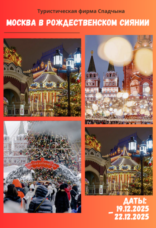 Автобусная обзорная экскурсия «Москва в Рождественском сиянии». Какой же праздник важнее Новый год или Рождество? А нарядная елка — атрибут какого праздника? Когда началась традиция украшать жилье на Рождество? Вот и Москва как радушная хозяйка подготовилась к празднику. Вы увидите исторические и архитектурные памятники в праздничном убранстве: красота и величие архитектурно-художественного ансамбля никого не оставит равнодушным, от красоты столицы со смотровой площадки на Воробьевых горах захватывает дух — блестят купола храмов, на площадях великолепные ели соревнуются между собой нарядами, бульвары и проспекты сияют и играют разноцветными огнями, на улицах — народные гуляния, музыка и веселье...