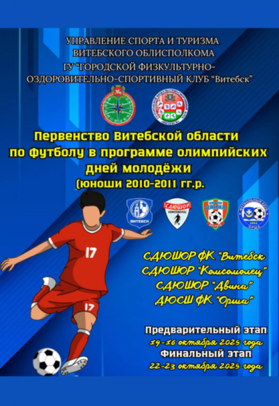 С 14 по 16 октября 2025 года, в городе Витебске, в воздухоопорном манеже СДЮШОР ГУ футбольный клуб «Витебск» (пр-т Людникова, 12) (Витебская зона), а также в г. Новополоцке, стадион ГСУ «ФК «Нафтан-Новополоцк», (ул. Молодежная, 49), (Новополоцкая зона) пройдут предварительные игры первенства Витебской области по футболу, в программе Олимпийских дней молодёжи Республики Беларусь (юноши 2010-2011 г.р.).