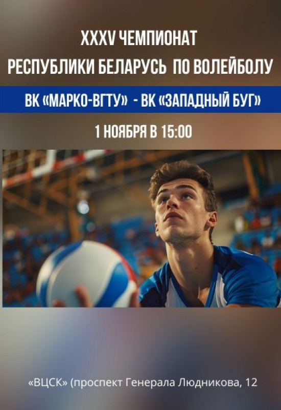 1 ноября, 15:00. XXXV чемпионат Республики Беларусь среди мужских команд высшей лиги по волейболу. Встречаются ВК «Марко-ВГТУ» и ВК «Западный Буг».