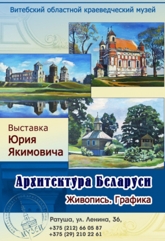 В дополнение к выставке «Безмолвная проповедь. Новгородская икона XIII–XIV вв.» в Ратуше — выставка, посвящённая выдающемуся исследователю белорусской архитектуры — Юрию Якимовичу. В экспозиции — оригинальные живописные работы, отражающих красоту и уникальность исторических зданий Беларуси.