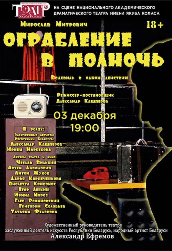 Спектакль «Ограбление в полночь» – это весёлая и занимательная комедия из жизни торговых работников с приключениями, разоблачениями, любовными историями и ограблением.