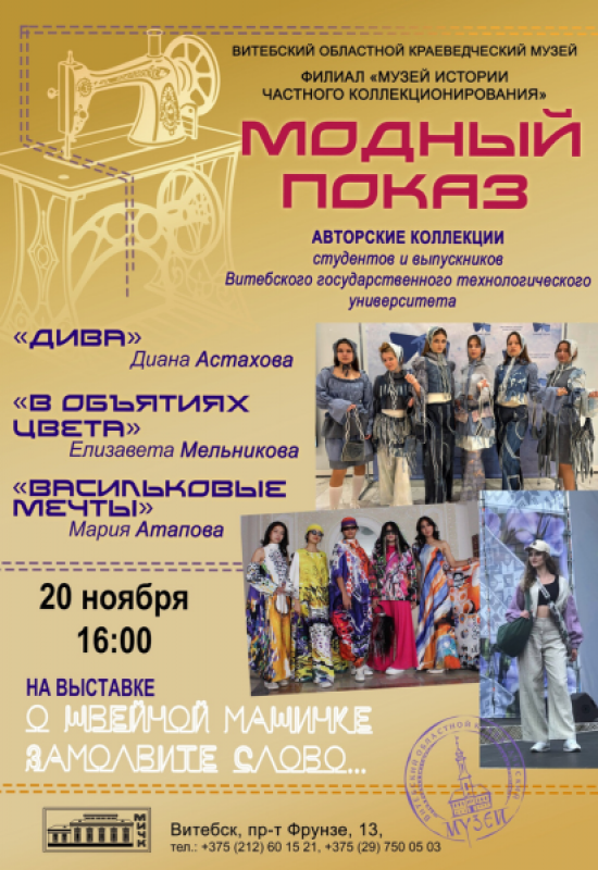 20 ноября в 16:00 приглашаем вас в Музей истории частного коллекционирования (пр-т Фрунзе, 13) на яркий показ коллекций одежды студентов и выпускников Витебского государственного технологического университета.