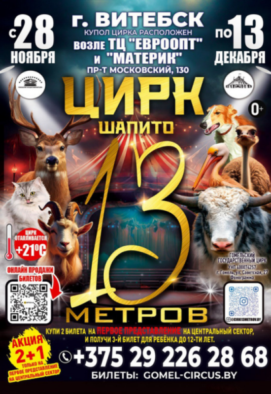 Цирковая компания «13 МЕТРОВ» представляет международную программу Гомельского цирка шапито с участием артистов: Беларуси, России, Киргизии.