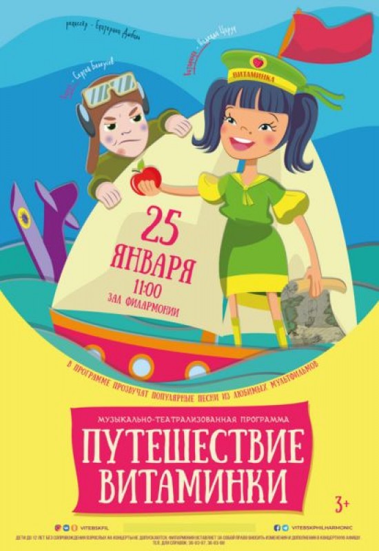 Филармония объявляет витаминизацию! Ребятам расскажут веселую историю о полезной Витаминке и вредном Вирусе. Витаминка знает, что здоровье необходимо детям и взрослым, а Вирус уверен, что болеть это так здорово! Чтобы выяснить, кто из них прав, герои отправятся в удивительное путешествие на континент Физкультпривет. Приключения будут сопровождаться популярными песнями из любимых мультфильмов: «От винта», «Бедненький больной», «Большая стирка», «Песенка-икалка», «Песенка о зарядке».