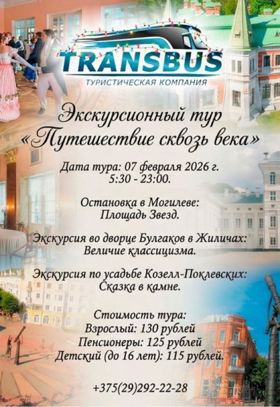 Пришлашаем вас в эксклюзивное однодневное путешествие, которое позволит вам перенестись в эпоху балов, аристократических приёмов и великих судеб. Маршрут нашего тура пролегает через знакомые места, где история застыла в камне, а величие прошлого ощущается в каждой детали. Вы посетите два уникальных дворцово-парковых ансамбля, каждый из которых является подлинным сокровищем национального наследи Беларуси.