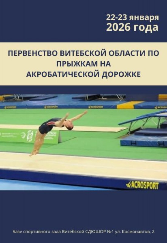 22-23 января 2026 года на базе спортивного зала Витебской СДЮШОР №1 (ул. Космонавтов, 2) пройдет Первенство Витебской области по прыжкам на акробатической дорожке (юниоры, юниорки).