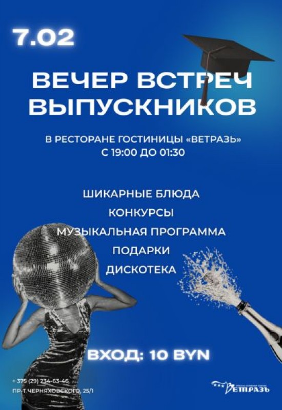 Приглашаем вас вспомнить годы учебы, наполнить сердца теплом дружбы и поделиться яркими моментами в ресторане гостиницы “Ветразь”.Вас ждут: