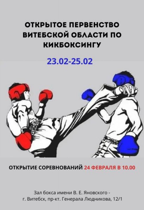 С 23 по 25 февраля 2026 года в г. Витебске на базе специализированного зала бокса имени В. Е. Яновского, по адресу проспект Генерала Людникова, 12/1 пройдет открытое Первенство Витебской области по кикбоксингу среди юниоров, юниорок, юношей, девушек, кадетов, посвященного Дню защитников Отечества и Вооруженных Сил Республики Беларусь