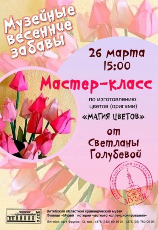 В рамках программы «Музейные весенние забавы» 26 марта 2026 г. в 15.00 состоится мастер-класс по оригами «Магия цветов» от Светланы Голубевой в Музее истории частного коллекционирования (пр-т Фрунзе,13).