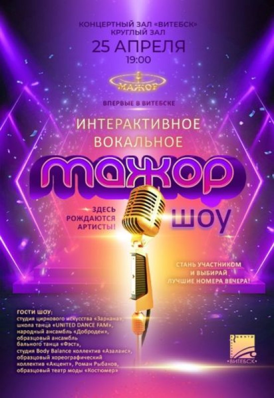 25 апреля в 19:00 в круглом зале концертного зала «Витебск» состоится отчётный концерт вокальной студии «Мажор» – интерактивное вокальное шоу «Мажор шоу».