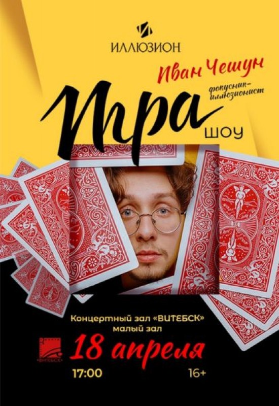 Забудьте о традиционном разделении на сцену и зрительный зал. «Игра» – это полное погружение в мир иллюзий, где каждый присутствующий становится не просто наблюдателем, но и участником. Шоу, которое расскажет нам о разных направлениях иллюзионного искусства. Вы пройдете через изящную классику, впечатлитесь иллюзией чтения мыслей и гипнотическими эффектами, попробуете себя в дуэле с соперником-шулером, который ювелирно владеет карточной магией.