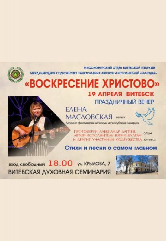 19 апреля 2026 г. в актовом зале Витебской духовной семинарии состоится праздничный концерт Содружества «Благодар», посвящённый Светлому Христову Воскресению.
