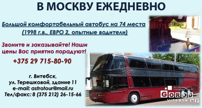 Ежедневные выезды. Витебск-Москва в 21-00 (автовокзал), 21-15 (пр-т Строителей), 21-40 (Московский пр-т)