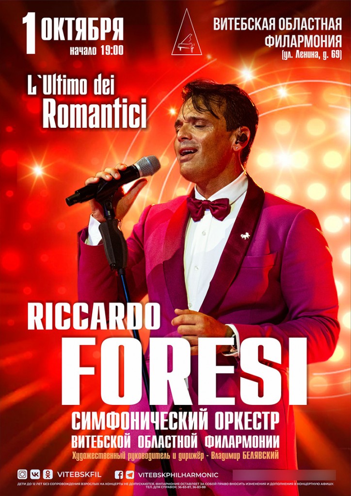 Грандиозный старт нового сезона! Филармония приглашает на музыкальный вечер с Riccardo Foresi – итальянским певцом, трубачом и автором песен! Riccardo Foresi – маэстро с голосом, покорившим мир, – впервые в Витебске! Вместе с Симфоническим оркестром Витебской областной филармонии он подарит публике два часа страсти, энергии и чистой итальянской магии! В программе хиты «Mamma Maria», «Felicità», «Vivo per lei», «Sarà perché ti amo» и многие другие! Приготовьтесь к вечеру эмоций, прекрасной музыки и той самой атмосферы dolce vita!