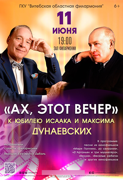 Этот вечер станет настоящим путешествием в мир любимых кинофильмов и песен, написанных талантливыми представителями знаменитой музыкальной династии. В программе концерта прозвучат бессмертные хиты из кинолент "Мэри Поппинс, до свидания", "Д’Артаньян и три мушкетёра", "Весна", "Весёлые ребята" и многих других, которые давно стали частью нашего культурного наследия.