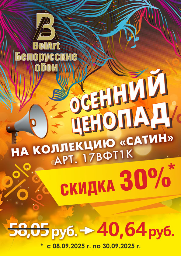 В фирменных магазинах "Белорусские обои" стартовала долгожданная акция "Осенний ценопад"! Теперь у вас есть уникальная возможность приобрести коллекцию "Сатин" по невероятно выгодным ценам.